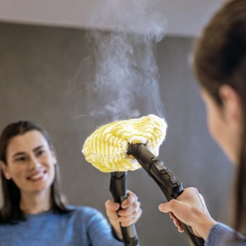 Reinigen und bügeln mit Dampf? Das ist mit dem SC 5 EasyFix von Kärcher perfekt möglich. Der leistungsstärkste Dampfreiniger seiner Klasse (4,2 bar Dampfdruck) kann auch an ein Dampfbügeleisen angeschlossen werden. Die gründliche Reinigung mit dem Kärcher Dampfreiniger beseitigt bis zu 99,999 % der Viren* und 99,99 % aller Haushaltsbakterien**, die sich auf den üblichen harten Oberflächen im Haushalt befinden. Ein vielfältiges Zubehör sorgt dafür, dass Fliesen, Kochfelder und Dunstabzugshauben auch bis in die kleinsten Ritzen sauber bleiben, egal wie stark sie verschmutzt sind. Die EasyFix Bodendüse mit flexiblem Gelenk sorgt für eine ergonomische Handhabung. Die Schaberklingentechnologie wiederum garantiert perfekte Reinigungsergebnisse. Das Bodentuch lässt sich ganz einfach an der Bodendüse befestigen und wieder entfernen, ohne mit dem Schmutz in Berührung zu kommen. Die VapoHydro-Funktion entfernt hartnäckigen Schmutz noch einfacher durch den Einsatz von heißem Wasser. Die Intensität des Dampfes ist einstellbar und kann je nach Oberfläche und Verschmutzungsgrad angepasst werden. Der Wassertank ist abnehmbar und kann ständig nachgefüllt werden: ideal für eine unterbrechungsfreie Reinigung. Weitere Highlights: integrierte Kabelaufbewahrung, Zubehörfach, Parkposition für die Düse