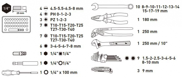 La trousse de 57 outils Kraftwerk 208.100.000 est composée d'outils indispensables pour tout artisan ou bricoleur : pinces, douilles, cutter, clés, clés Allen...